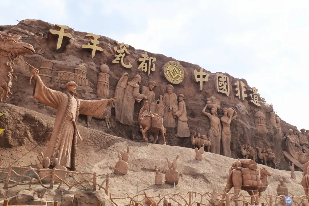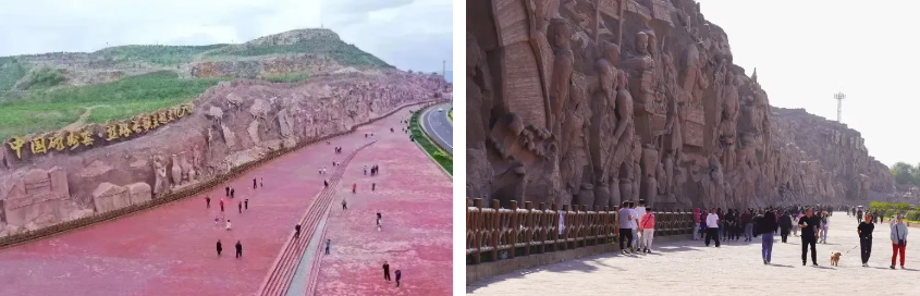 中国磁州窑•丝路长歌主题文化广场位于峰峰磁州窑路(原新义公路)中段,浮雕全长1000米、高30米,是以磁州窑大型山体浮雕为核心的文旅景点。画面以火为中心,从瓷器成型、薪火相传到誉满华夏、走向世界,全景式展示了千年瓷都彭城古镇的市井风情、磁州窑制作工序,以及东出大海、西走沙漠、远销海内外并受到各国人民喜爱的二十多幅场景。