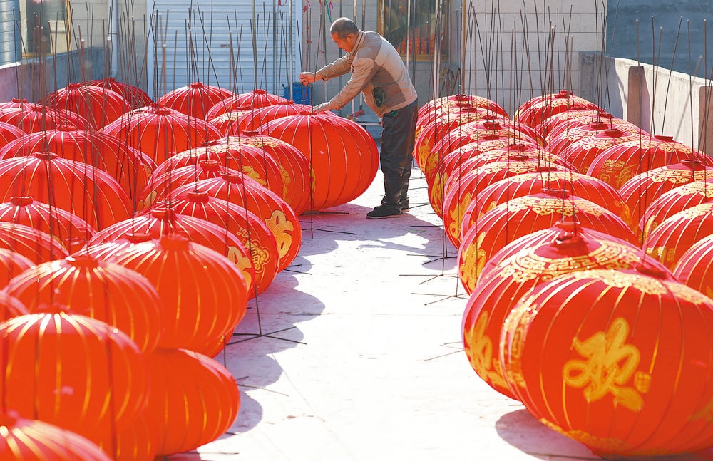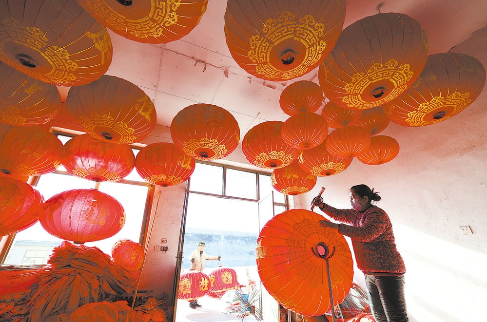村民们正在忙着制作灯笼。
