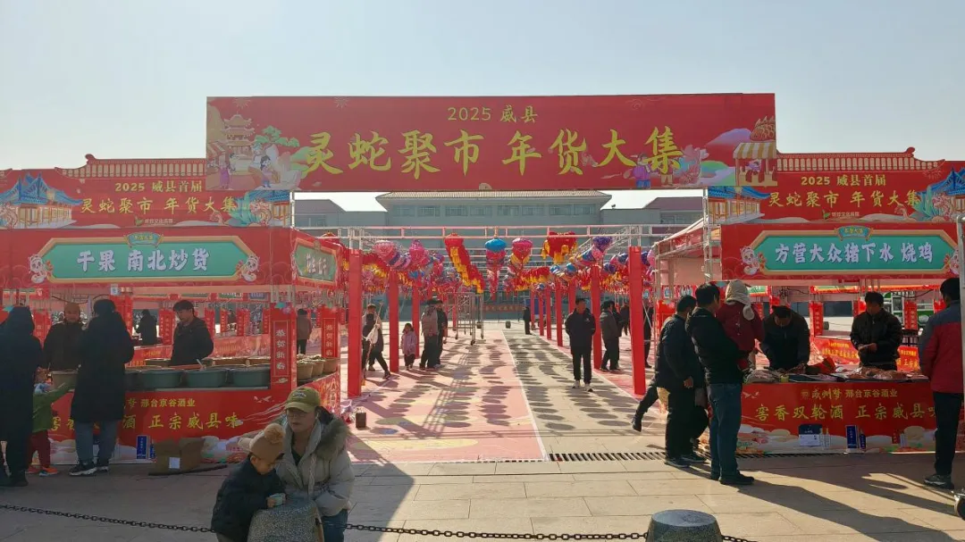 1月19日 - 1月27日在威县人民广场持续举办2025年威县首届灵蛇聚市年货大集活动,为广大市民提供一个集中购买春节所需各类年货的场所,还特别展示了威县本地的土特产品,让群众能够一站式购齐各种具有地方特色的年货。