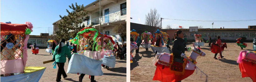 在姚庄村,一场别开生面的民俗表演正在筹备中。村民们将现代元素注入到传统的旱船、竹马等节目并进行了创新编排,借鉴现代舞蹈、体育表演等队形变化,创造出新颖、复杂、富有视觉冲击力的队形,展现出更加灵动和多样化的效果,让古老的民俗焕发出新的活力。