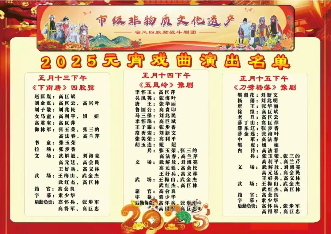 时间:2月10日——12日(正月十三至十五)下午戏曲专场;2月11日(正月十四)晚7点文艺晚会