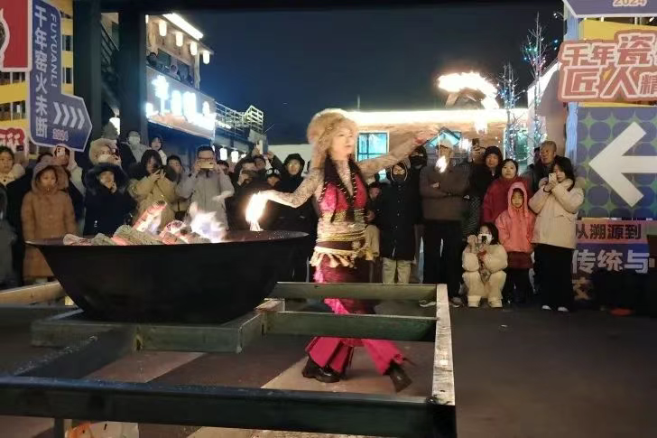 “非遗社火闹元宵” 活动选取了王看最具代表性的社火节目,将非遗苇子灯阵、高跷、旱船、舞龙、跑竹马、红拳等以沿街巡游的方式进行展演。巡游队伍浩浩荡荡,宛如一条奔腾的巨龙。在广场处,专门设置了非遗文化体验区,并且在村里道路两旁,用砖块和黄土盘起了为群众体验“烤百病” 习俗所用的十个火灶。