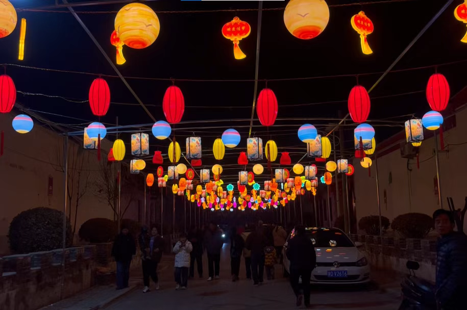 村内主街道完成华丽变身,街道两旁的路灯杆上,每隔一段距离就悬挂着一盏大红灯笼,灯笼下方系着鲜艳的红色中国结,随风轻轻摇曳。一到夜晚,灯光亮起,整个街道瞬间被温馨浪漫的氛围笼罩,仿佛一条璀璨的星光大道。