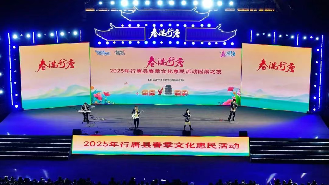 光影渐隐,激情再起。紧随其后的“春满行唐”摇滚之夜,将现场气氛推向高潮。糖果乐团与LUCKY乐团轮番登台,《孤勇者》《不再犹豫》等耳熟能详的摇滚金曲响起,激扬的旋律、劲爆的鼓点、张扬的歌声,激发了现场每一位观众的热情,大家挥舞着荧光棒,随着音乐摇摆、纵情跳跃,尽情释放内心的激动与欢快。