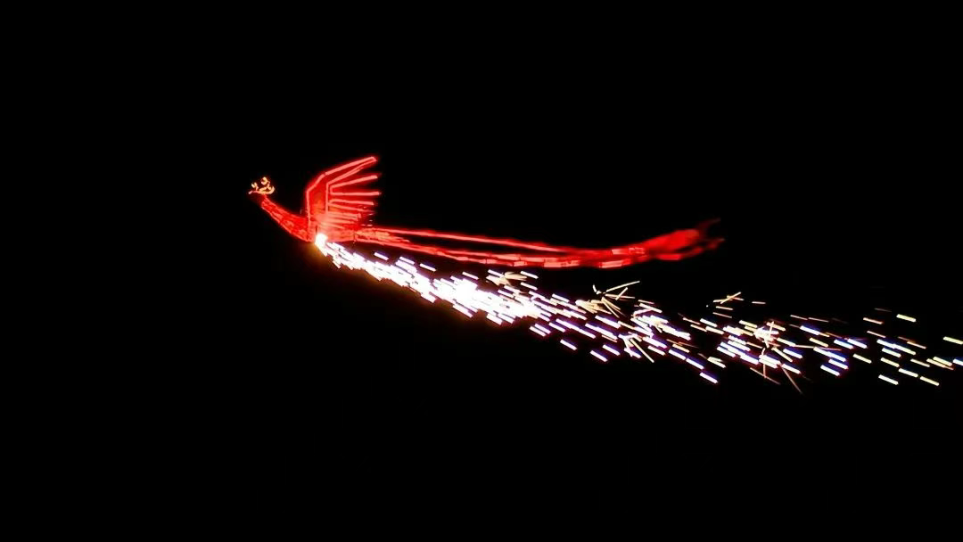 夜幕降临,颍水河畔化身光影交织的奇幻舞台。作为本次活动的重头戏,“光影行唐”裸眼3D光影秀以颍水河为背景,通过前沿数字技术,将行唐的历史文化、山水风光与现代艺术创意深度融合。文昌阁上,巍峨古建筑拔地而起,非遗技艺跃然“水”上,璀璨星河倾泻而下,观众无需佩戴3D眼镜,即可感受扑面而来的立体视觉冲击。随着凤凰飞天音乐的奏响,一只“金凤凰”从文昌阁飞出,在夜空翩翩起舞,与盛焰为伴,振翅划空而来,展翅、回旋、攀升,演绎着“凤舞颍水”的神话意境,为现场观众献上了一场璀璨夺目的视觉盛宴。