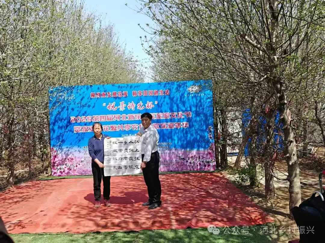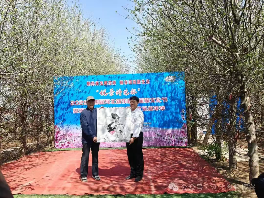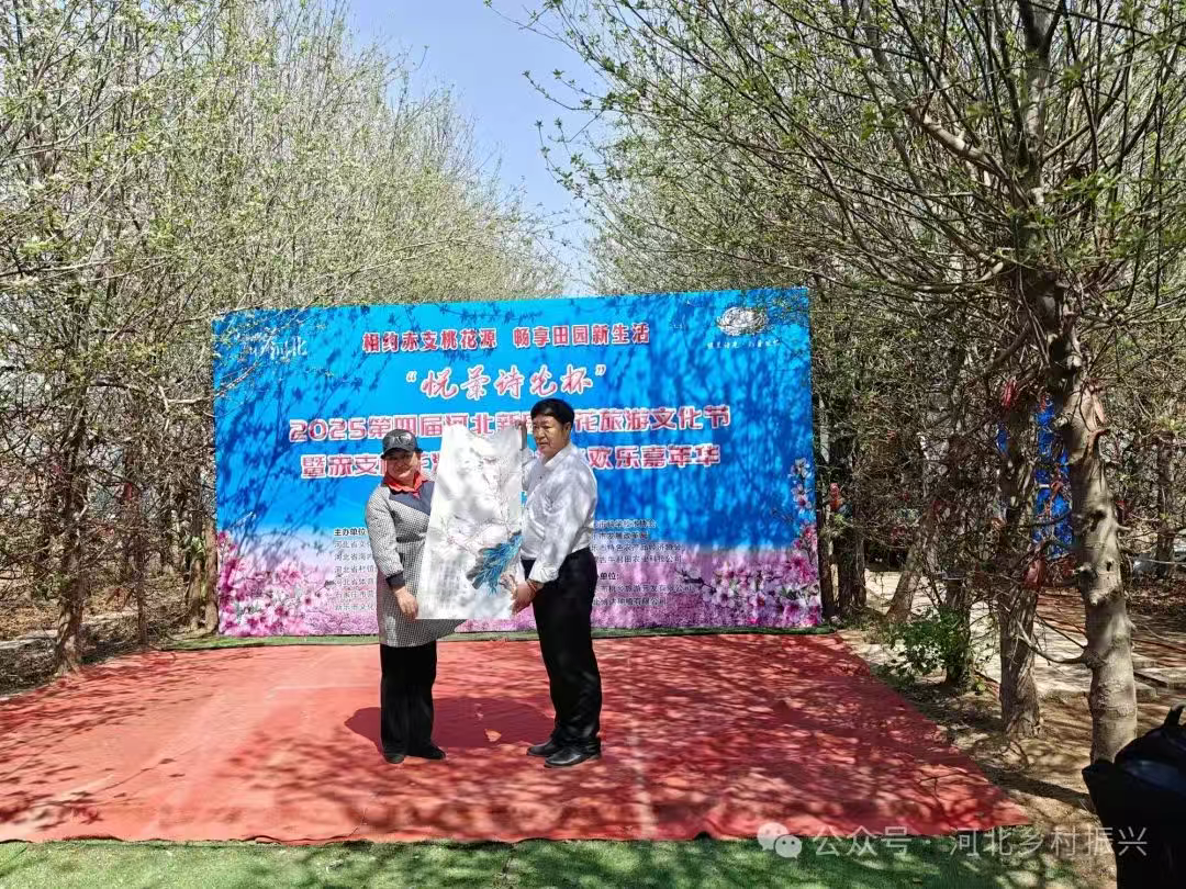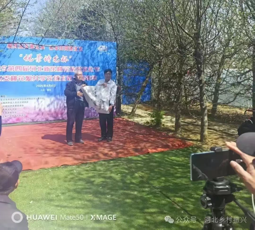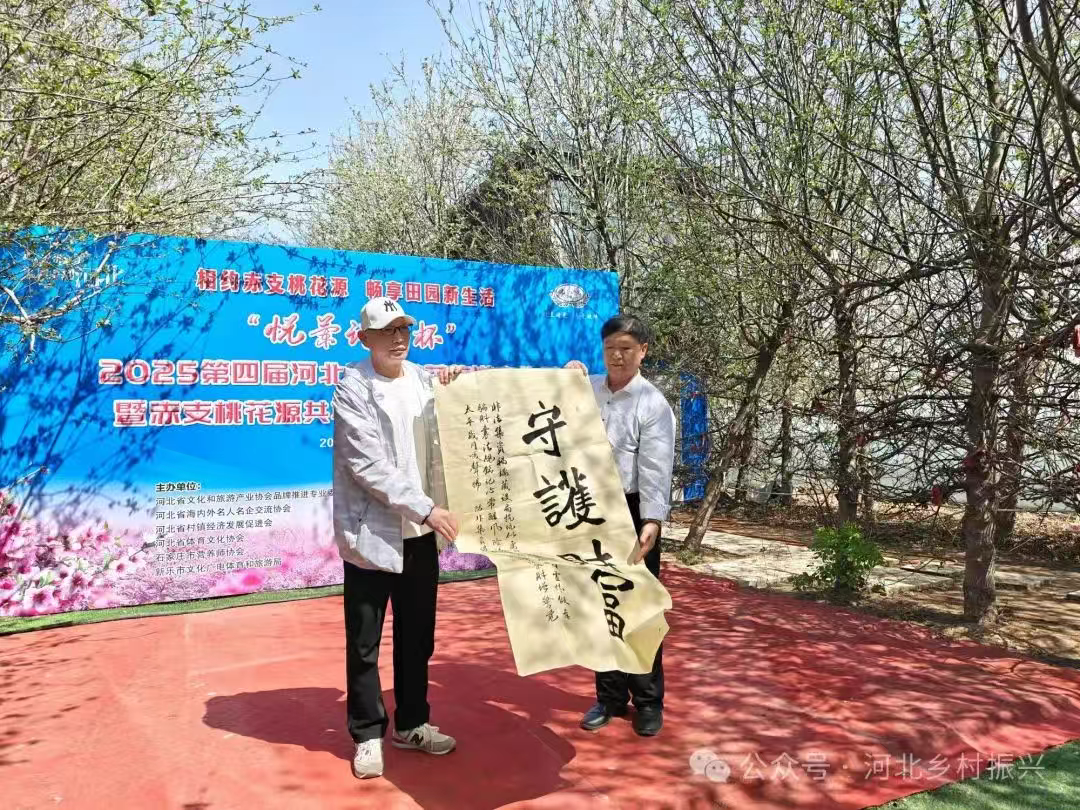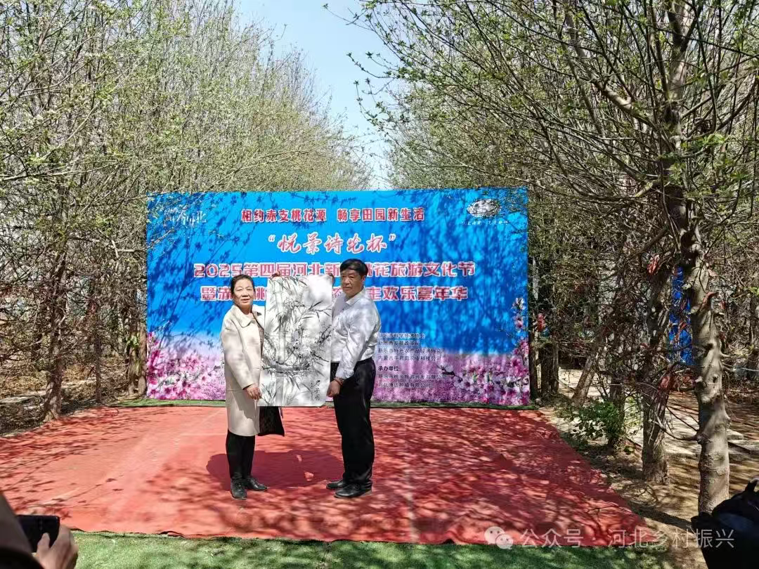 在活动现场,河北省文化名人公益联盟书画院携12位艺术家呈现文化盛宴。常务副院长张三、副院长范新喜、院士李凤梅、闫运来、董广英、刘润香、李芙萍、杜俊敏、孙金荣等名家创作的《桃源春韵》等23幅书画作品赠送给了赤支桃花源公社,将在园区田园科普画廊永久性展出。