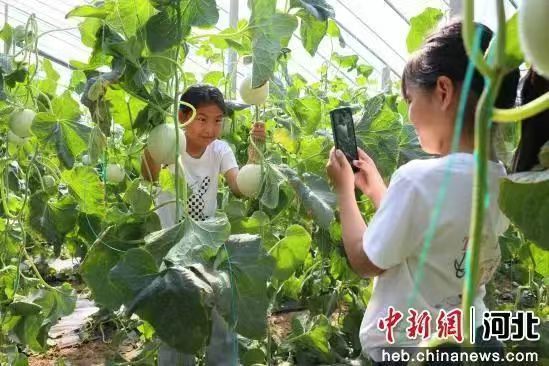 近日,正是果蔬成熟的季节,在河北省南宫市段芦头镇南张庄村果蔬种植基地的温室大棚里,大棚甜瓜、香瓜、西瓜等果蔬进入采摘期,游客们手拿小篮穿梭其中,一边采摘果蔬,一边享受惬意的美好时光。图为在南宫市段芦头镇南张庄村果蔬种植基地的温室大棚里游客正在采摘游玩。 王林 摄