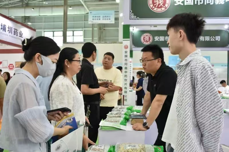 开幕式现场,太极集团、以岭药业等30余家行业龙头、千余家中医药企业、万余名国内外药商药企代表齐聚“千年药都”。世界非物质文化遗产大会执行主席、中国健康产业投资基金副总裁朱英华,为安国市颁发“世界非物质文化遗产大会中医药传承基地”证书。中国国家创新与发展战略研究会副会长单威,受聘为安国市健康文旅产业发展顾问。图为第二十七届国际药材节上,参展企业热情接受客户咨询。张亚德 摄